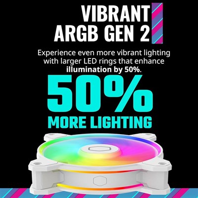 The Cooler Master MasterFan MF120 Halo² (model: MFL-B2DW-21NP2-R2) brings together cutting-edge technology and stunning design. It is engineered to provide excellent cooling efficiency while adding vibrant, customizable RGB lighting to your system. The fan features Duo-Ring ARGB Gen 2 LED Rings that offer a spectacular light show with multiple lighting modes and effects. These LED rings can be synchronized with other ARGB components for a cohesive lighting experience.